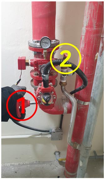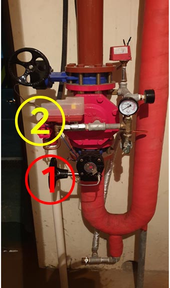| 스프링클러(알람밸브/프리액션밸브)가 오동작을 일으켰을 때는 최우선으로 먼저 아래쪽에 있는 ①번 개폐밸브를 시계방향으로 돌려 잠가줍니다. ②번 배수밸브를 열어 배관내의 물을 배수 시킵니다. -종합- ① 밸브를 시계방향으로 폐쇄 ② 배수밸브 개방 |